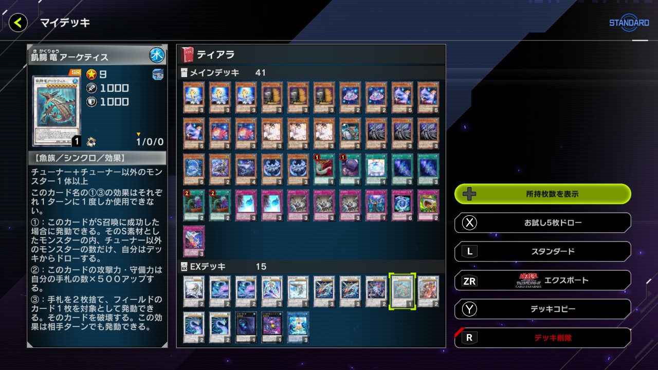 この記事で相手ターンに10シンクロと書かれているのは最果てのゴーティスのことを指します 最果ての宇宙とかゴーティスなんちゃらと紛らわしい名前が多いからです… デッキ twitterにも載せたやつ ・コンセプト 従来のゴーティスの動きにタイダルやストリーム、エジルで手札・デッキのアンコウを切りながら展開していきます。 色々と動けるので私も操作ミスもするし、勝ち確寸前で時間切れで負けたこともある。 やりたいことをやるためにデッキが動くことを意識しているので相手のバックや妨害に弱く、伏せ剥がしや先行展開に対する解答は弱めになっています ●タイダルとゴーティスの相性 タイダルはレベル7でゴーティスのチューナーはレベル2なので噛み合わせは良くないです。 アーケティオス出せるので腐らないのは評価できますが、 アーケティオスは相手ターンに効果も使えるし、弱いカードではないですがそこまで便利なカードといわれるとうーんな感じです。 墓地肥やすメリットですが、ゴーティス単体だと墓地を肥やすメリットは皆無ですし、魚版終末のデッドリーフ君(+姫)がいるので わざわざ手札2枚使って召喚権使わずに墓地肥やして何か意味があるかと言われるとありませんし、リーフ引けなくても宇宙シフorぺイシスでイグシープサーチでシンクロする準備もできますしね… こんなに酷評しているのになんでタイダル採用したゴーティスを使うようになったか 個人的には ・ストリームでリクルしてリンク値を2回分確保 ・素引きしてもアンコウ落とせば横に広げつつ、結果的に墓地に魚族が肥える ・地味に高打点 ・2種類目の劣化スノーピオス ・墓地のアスカーンを除外することで手札消費なしで場にレベル8+αが出る ことが評価できる点だと判断し、使うことに決めました ●アンコウ(素早い)採用するメリット ビーバー以外は魚族なのでゴーティスの餌になります。 アンコウの効果が起動すれば 素早い×2→スプリンド→シフ or アンコウ→素早い×2 と最低でも魚が4体墓地が超えるのでスノーピオスタイダルのコストが確保できます。 また、デッドリーフの墓地肥やしが今までは単純にシフ落とすだけでしたが、アンコウを落とすことで墓地により多くの魚を肥やしたり、盤面が色々と伸びるようになるので色んな事が出来る ●採用カード(上記以外に関して) ・デッドリーフ 普通のゴーティスより強くなった 特にドロー効果を使う機会が多くなった。 ゴーティスは戻したい魚はアスカーン除くシンクロぐらいで諸刃の剣のカードだったけど、 素早いを戻してワンチャン!遊べるぞ!な動きもできるようになったのが大きかったです ・クシャトリラ組 汎用枠の皮を被った展開要因 特にフェンリルティアクシャはリンク素材として優秀です オーガに関してはGもらいにくいSS持ち アタッカーとしても使えますし、最悪リンク素材にします ・エジル ストリームタイダルがなく、アンコウがいる時に動けないことが気になったので アンコウの新たな切り先として採用 召喚権使わずに展開できるのはえらいと思いました 手札にいても困るのが多いですし、宇宙で飛ばすぐらいなら一度墓地に落として除外するのが無駄がないと思いました ・最果ての宇宙 良くも悪くも潤滑油 アンコウのおかげで墓地に魚が貯まりやすくなったのでコストは豊作になったかもしれない ・氷結界 副葬+氷結界2枚以上採用すべきか悩みましたが、 素引きした氷結界は展開要因になりにくいのが気になりました 1枚も採用していないと微妙に困るシチュエーションがあったので1枚だけ採用していますが 半端すぎる採用だったかなーと思いました ティアクシャ落としてガチャが出来る! ・虹光 貴重な妨害枠 レベル2チューナー+素早いで作れます ただ、最初から採用していますが一度も使ったことないし、出さなくとも何とかなっているので悩む ・アーリィ 最初は採用していませんでしたが、展開用のリンクしか入れていなかったので 妨害枠として採用。リンクが右向きなのが地味にありがたい スプリンドのバウンスはエクシーズ不採用だと妨害札としては相手依存なので妨害枠として基本的にはカウントしていません。エクシーズ使うならカッパ等のランク2やランク7を採用してください。 ・展開√ その1 アンコウストリーム アンコウ切ってストリーム効果、タイダルSS。 アンコウ効果でマンボウ×2SS。マンボウタイダルでスプリンド 分岐1 手札にレベル2チューナー スプリンド効果でアンコウ落としてマンボウビーバーSS。 レベル2チューナー召喚し、 パターンA ビーバーチューナーで虹光(チューナーがシフならマンボウ対象にして除外) パターンB 素早い2体チューナーでアリオンポス。効果でぺイシスorシフ除外 分岐1結果 パターンA スプリンドマンボウ×2虹光 除外シフ パターンB スプリンド素早いアリオンポス 除外シフorぺイシス パターンAは虹光の1妨害に8シンクロやアリオンポスでサーチしたスノーピオスで疑似妨害 パター