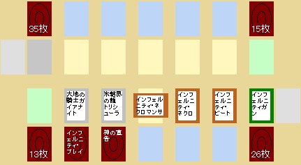 だいたい、こちらから見て3ターン目に始動可能かも。 構築上、序盤(3ターン)を如何に耐えることが出来るかが鍵になっている。 ヴェーラークロウはサイドでなんとかするか強行プレイで押し切る予定。 時間があれば、明後日ブランチでこのデッキで参加する。 Exがパンパンで何枚か迷うがおおよそ確定した。 問題は百眼とインデスのどちらを入れるか。 試験用で簡易融合入れているけど、つよわすぎて何とも。 少なくとも、初手にインフェルノ蘇生(zero)があれば簡易が無くても立ちまわれるからいらないし、 序盤を耐えるだけならライフ1000はリスクが高いかも。 ただ、チェインを作ったり、リヴァイエールを作りやすいのは便利なんだけどねー zero-maxは戦闘を行えないのが辛いがミラージュと違って召喚権を使わないし、バックにセットできるのでハンドレスになりやすいのが便利ですね。 さっき回した時のログを追記に載せます。 DO自体今日、触り始めたので動きがつたないというか対戦相手いないのでは結構適当。 エンド以外のフェイズははしょっています。 名前は適当 1ターン目 老樹 佐奈:ニューゲームを開始 老樹 佐奈:デッキをシャッフルしました 老樹 佐奈:カードをドロー 老樹 佐奈:カードをドロー 老樹 佐奈:カードをドロー 老樹 佐奈:カードをドロー 老樹 佐奈:カードをドロー 老樹 佐奈:カードをドロー 老樹 佐奈:手札から強欲で謙虚な壺を表表示でセット 老樹 佐奈:簡易融合(インスタントフュージョン)をデッキからめくりました 老樹 佐奈:簡易融合(インスタントフュージョン)をデッキからめくりました 老樹 佐奈:神の宣告をデッキからめくりました 老樹 佐奈:フィールドのカードを入れ換えました 老樹 佐奈:神の宣告を手札に入れました 老樹 佐奈:強欲で謙虚な壺を墓地に置きました 老樹 佐奈:カードをデッキに置きました 老樹 佐奈:カードをデッキに置きました 老樹 佐奈:デッキをシャッフルしました 老樹 佐奈:手札から裏表示でセット 老樹 佐奈:手札から裏表示でセット 老樹 佐奈:ターン終了 2ターン目 老樹 佐奈:カードをドロー 老樹 佐奈:インフェルニティ・インフェルノを発動 老樹 佐奈:インフェルニティ・インフェルノを墓地に置きました 老樹 佐奈:強欲で謙虚な壺を墓地に置きました 老樹 佐奈:自分のデッキを開いて見ています 老樹 佐奈:インフェルニティ・ネクロマンサーを墓地に置きました 老樹 佐奈:インフェルニティ・デーモンを墓地に置きました 老樹 佐奈:自分のデッキを閉じました 老樹 佐奈:デッキをシャッフルしました 老樹 佐奈:インフェルニティ・インフェルノを墓地に置きました 老樹 佐奈:手札から裏表示でセット 老樹 佐奈:手札から裏表示でセット 老樹 佐奈:手札からインフェルニティ・ビートルを表表示でセット 老樹 佐奈:インフェルニティ・ビートルの効果を発動 老樹 佐奈:インフェルニティ・ビートルをリリースします 老樹 佐奈:インフェルニティ・ビートルを墓地に置きました 老樹 佐奈:自分のデッキを開いて見ています 老樹 佐奈:デッキからインフェルニティ・ビートルを表表示でセット 老樹 佐奈:デッキからインフェルニティ・ビートルを表表示でセット 老樹 佐奈:自分のデッキを閉じました 老樹 佐奈:デッキをシャッフルしました 老樹 佐奈:ZERO-MAXを発動 老樹 佐奈:自分の墓地からインフェルニティ・ネクロマンサーを表表示でセット 老樹 佐奈:ZERO-MAXを墓地に置きました 老樹 佐奈:インフェルニティ・ネクロマンサーを表守備表示 老樹 佐奈:自分の墓地からインフェルニティ・デーモンを表表示でセット 老樹 佐奈:自分のデッキを開いて見ています 老樹 佐奈:インフェルニティガンを手札に入れました 老樹 佐奈:自分のデッキを閉じました 老樹 佐奈:デッキをシャッフルしました 老樹 佐奈:手札から裏表示でセット 老樹 佐奈:インフェルニティ・ビートルを墓地に置きました 老樹 佐奈:インフェルニティ・ビートルを墓地に置きました 老樹 佐奈:エクストラデッキから大地の騎士ガイアナイトを表表示でセット 老樹 佐奈:自分の墓地からインフェルニティ・ビートルを表表示でセット 老樹 佐奈:インフェルニティ・デーモンを墓地に置きました 老樹 佐奈:自分の墓地のインフェルニティ・デーモンを指定 老樹 佐奈:インフェルニティ・ネクロマンサーの効果を発動 老樹 佐奈:自分の墓地からインフェルニティ・デーモンを表表示でセット 老樹 佐奈:自分のデッキを開いて見ています 老樹 佐奈:インフェルニティ・ネクロマンサーを手札に入れました 老樹 佐奈:自分のデッキを閉じました 老樹 佐奈:デッキをシャッフルしました 老樹 佐奈:インフェルニティガンを発動 老樹 佐奈:インフェルニティ・ネクロマンサーを墓地に置きました 老樹 佐奈:エクストラデッキから氷結界の龍 トリシューラを表表示でセット 老樹 佐奈:インフェルニティ・ネクロマンサーを墓地に置きました 老樹 佐奈:インフェルニティ・デーモンを墓地に置きました 老樹 佐奈:インフェルニティ・ビ